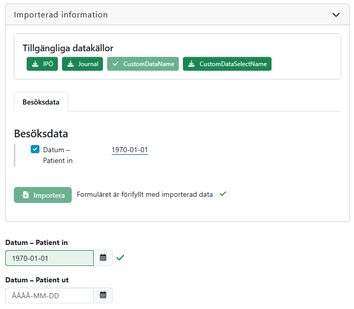 Notera den gröna markeringsfärgen på fälten. Samma markeringsfärg ska användas till listkomponenter som har importerad data, såsom MultiboolGroup. Märk även ikonen, check (utan cirkel), som används när det inte rör sig om en knapp eller label (se Specialfall: circle-check) och som ligger utanför fälten och visar att data har importerats.