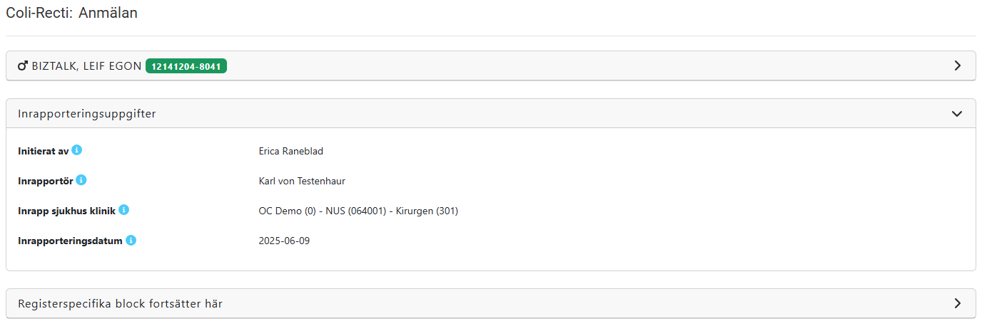 Inrapporteringsformulär för rollen inrapportör i Kolorektalcancerregistret.