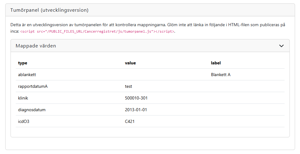 Komponenten Tumorpanel används för att mappa olika värden från variabler i formuläret till cancerregistret. Det här blocket syns endast för rollen monitor.