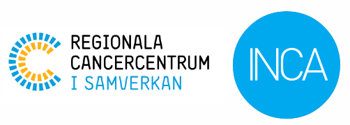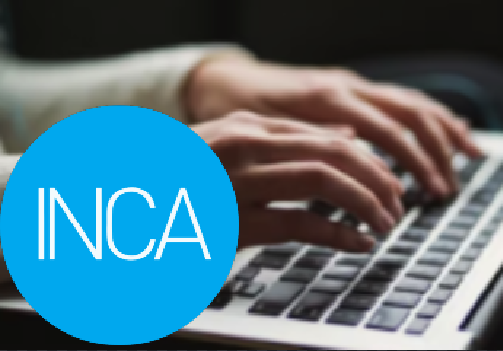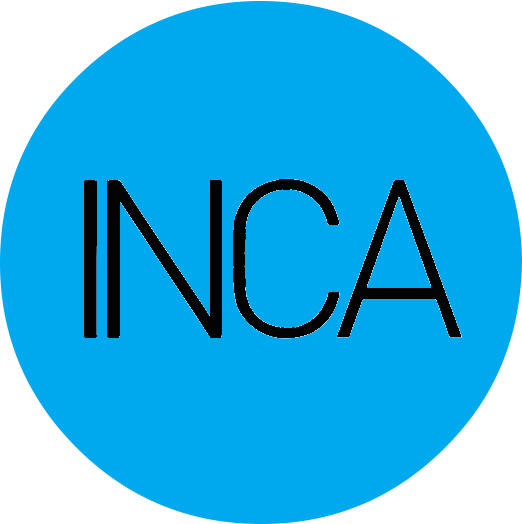 INCA:s logotyp är rund med en ljusblå bakgrundsfärg och en vit text där det står INCA (informationsnätverk för cancervården).